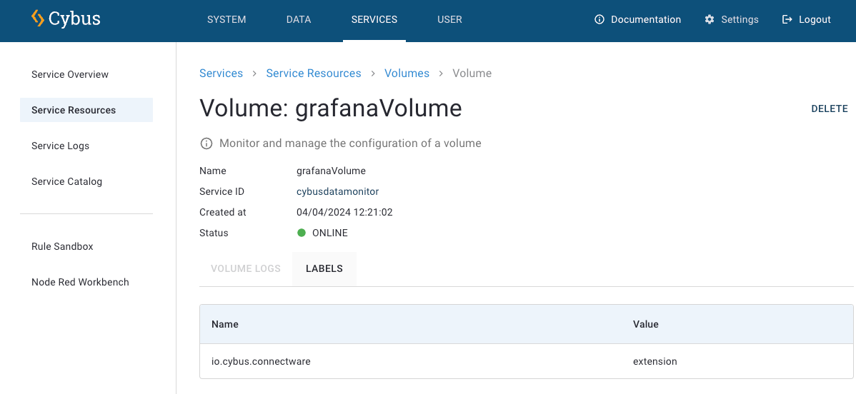 Volumes are used as persistent storage. The overview page shows information about which service the volume belongs to, its name ([resource ID](https://docs.cybus.io/1-10-1/documentation/services/service-resources-view/broken-reference)), the creation date and time, and its status.