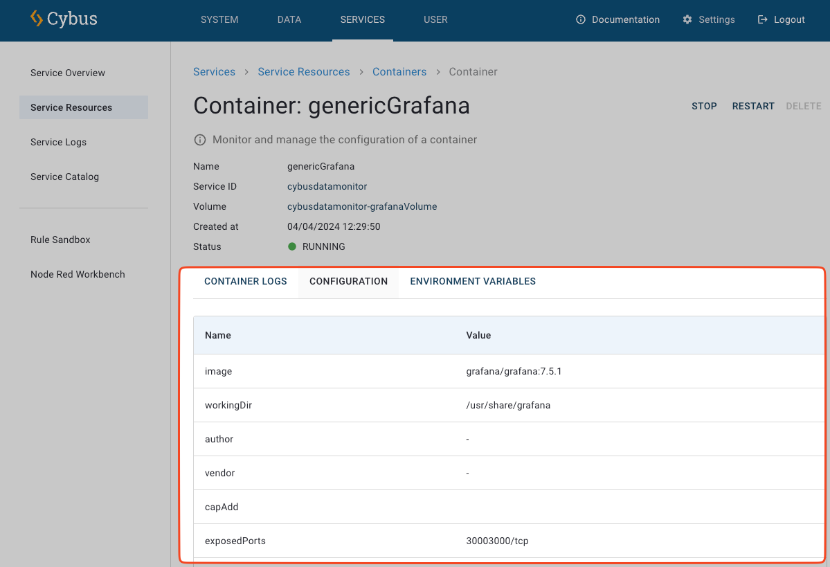 Manual stopping or deletion of containers will render the corresponding service to be [deviated](https://docs.cybus.io/1-10-2/documentation/services/deviation) (i.e. only partially functional). This is indicated by a yellow warning popup window at the bottom left of the screen. To restore the initial settings it is always possible to [disable](https://docs.cybus.io/1-10-2/documentation/services/setting-up-and-configuring-services/disabling-services) and then again [enable the service](https://docs.cybus.io/1-10-2/documentation/services/setting-up-and-configuring-services/enabling-services).
