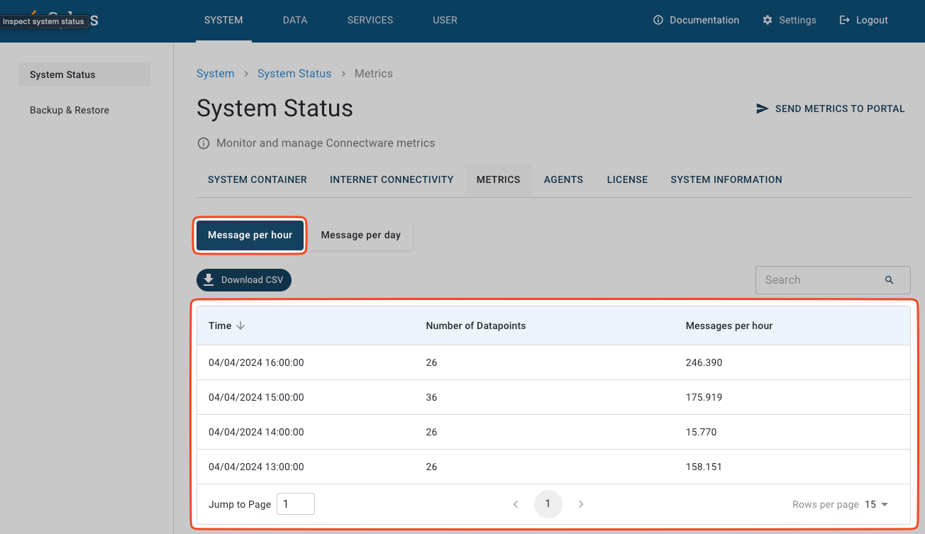 3. The `Metrics` tabs shows a number of values collected throughout operational times.