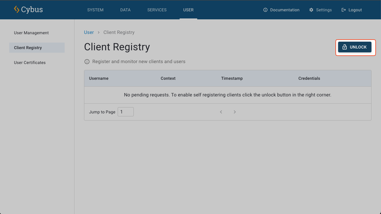 1. In the [Client Registry View](https://docs.cybus.io/1-11-0/documentation/client-registry/client-registry-view), click the **Unlock** button to temporarily unlock the self-registration. The registry will remain open for five minutes and will automatically lock again after this period. You can manually lock the registry by clicking the **Lock** button.