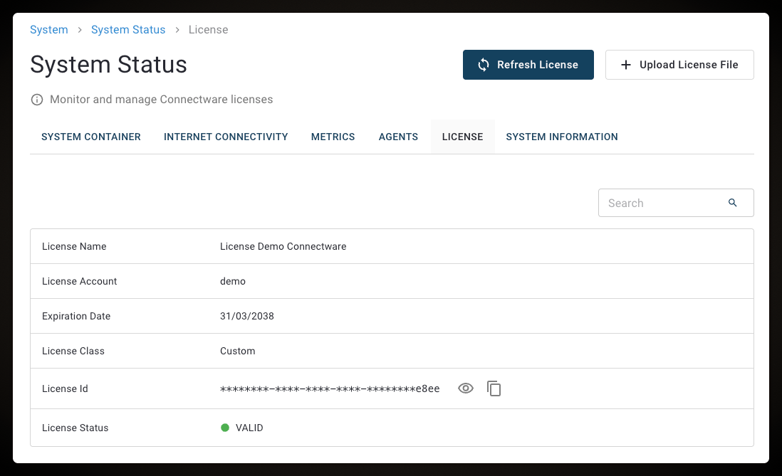 The **License View** displays information of your active Connectware license. Each time you start Connectware, the license is automatically validated over the Internet. If your Connectware installation does not have Internet access, you can upload a valid license file manually.