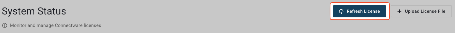 You can manually [refresh your license](#manually-refreshing-licenses-in-connectware) via the **Refresh License** button. You can [upload a new license file](#uploading-license-files-to-connectware) via the **Upload License File** button.