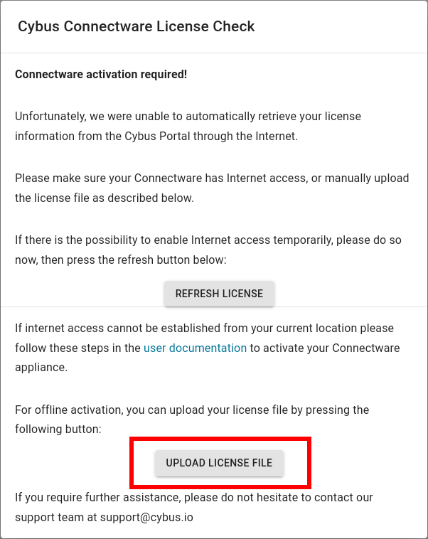 1. In the **Cybus Connectware License Check** dialog, click **Upload License File**.