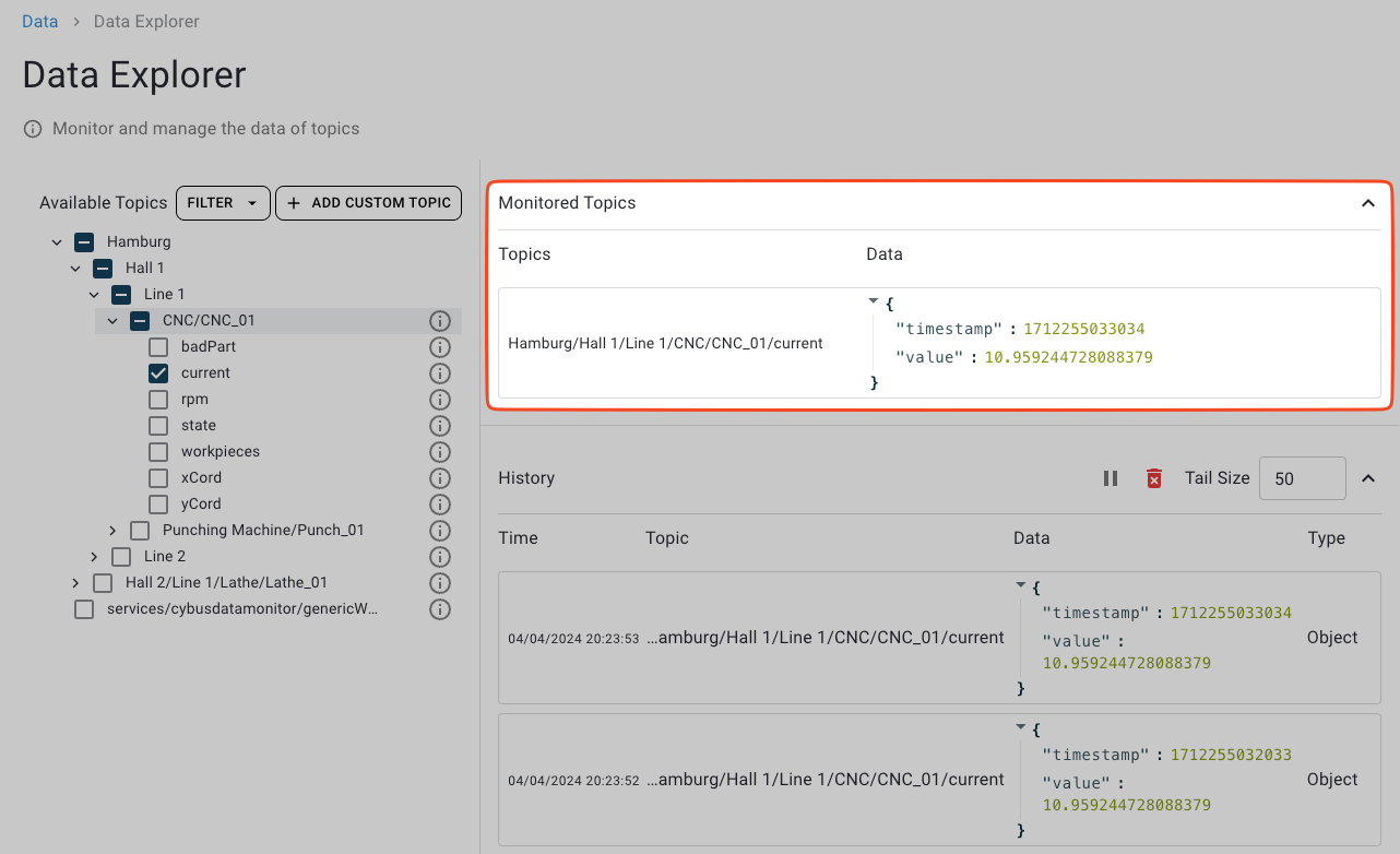 Once new data is available on a monitored topic, the data of that topic will be updated here in the Monitor section.