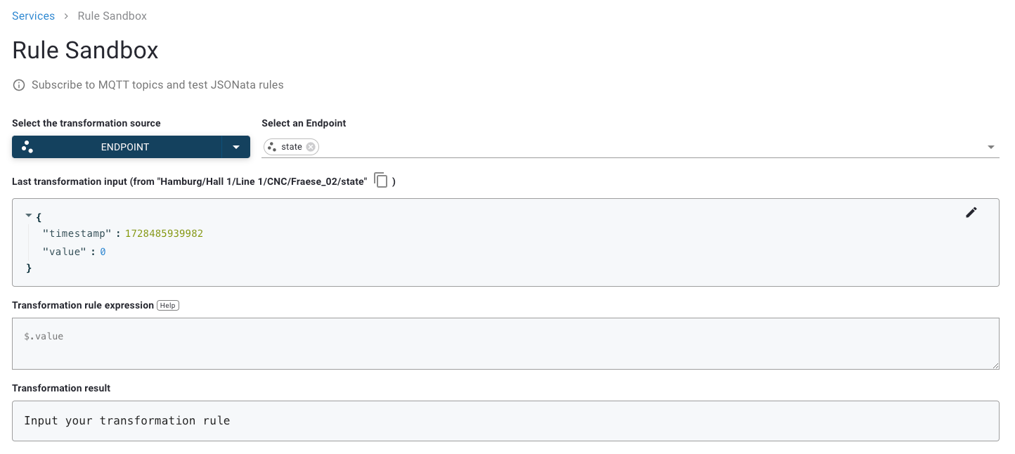 * If you have selected **Endpoint** or **MQTT Topic** as the trasnformation source, this field displays the last detected transformation input for the selected endpoint or MQTT topic. You cannot enter custom transformation here.