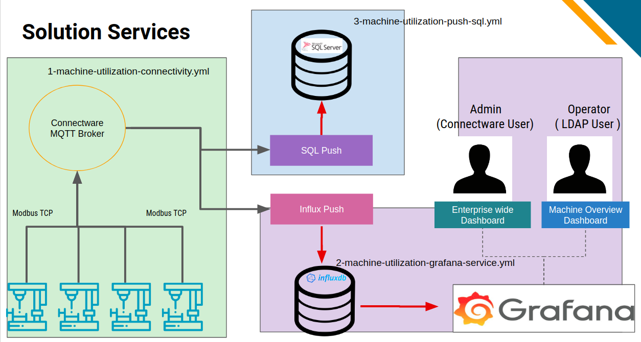 # Machine Utilization Example (Multi file service composition) : Modbus TCP + InfluxDB + Grafana + MSS