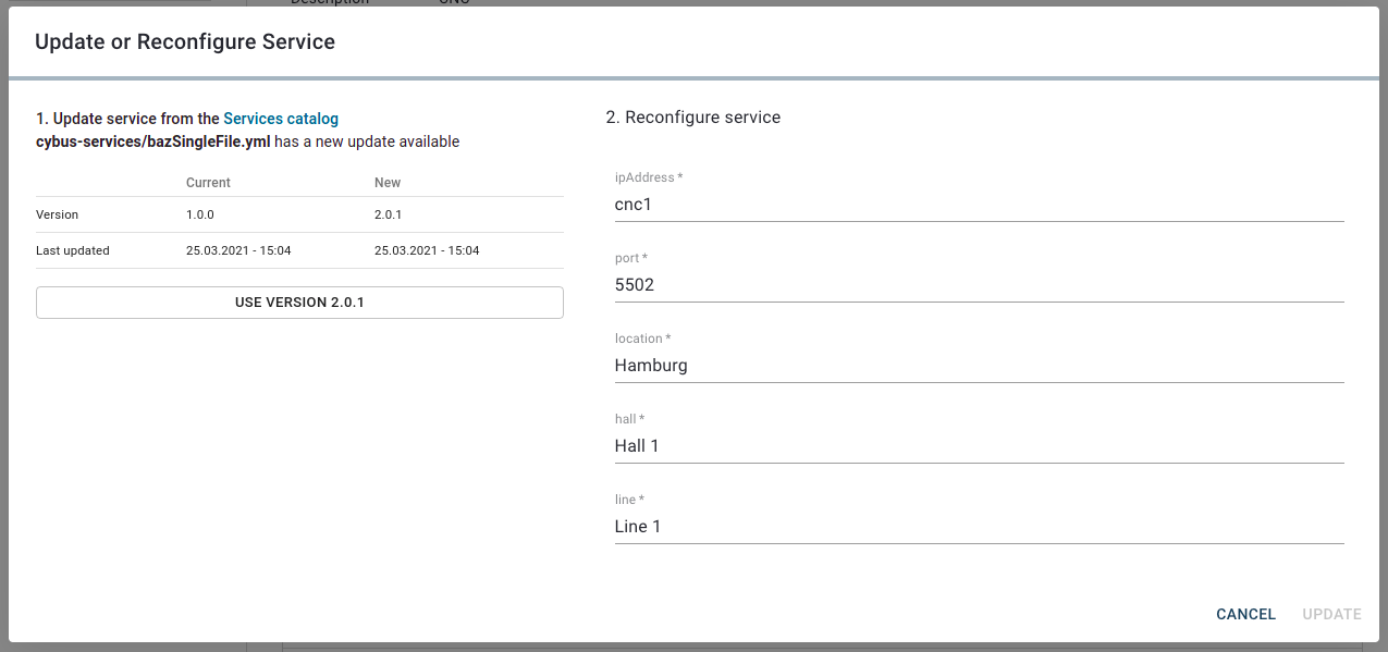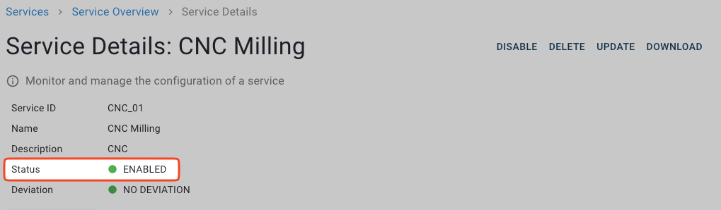* Further buttons in the upper right section are available to [update / reconfigure](#updating-services), or [delete](https://docs.cybus.io/1-7-3/documentation/working-with-service-commissioning-files#removing-services) the service. If the service is enabled, those buttons are inactive (grayed out).