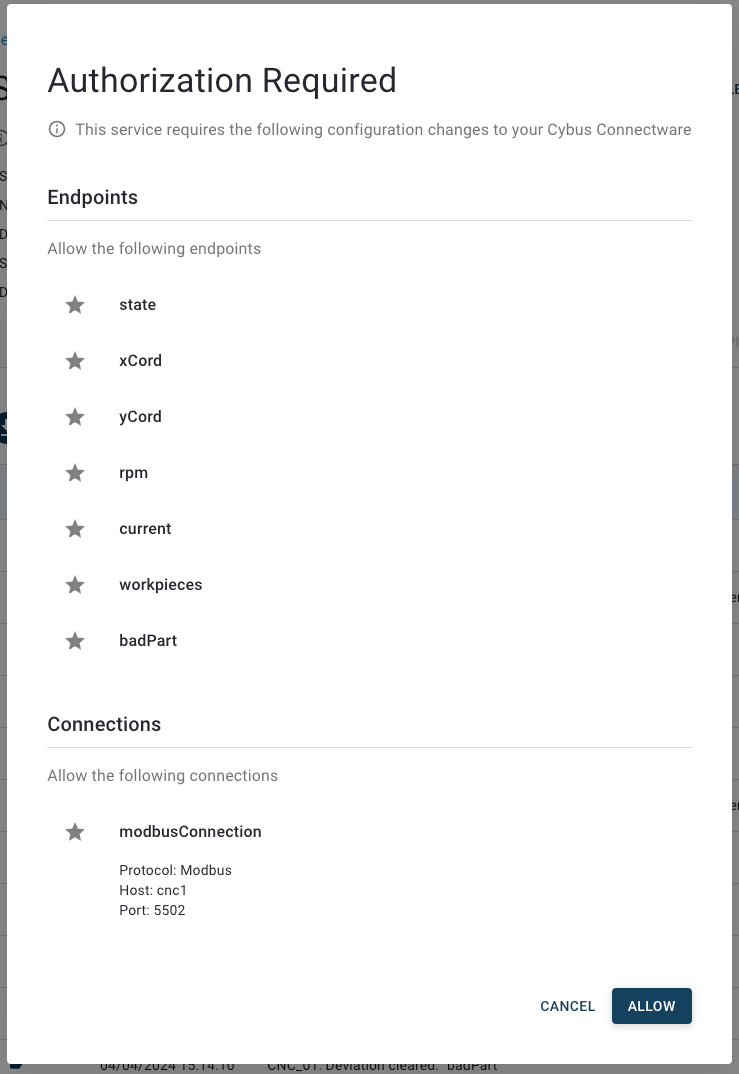 2. This will open the *Authorization Required* dialog which provides a short summary of all the resources that your service needs to access in order to fully function. Make sure to review the requirements thoroughly. Once you are done, enable the service by clicking `Allow` in the bottom right corner of the *Authorization Required* dialog.