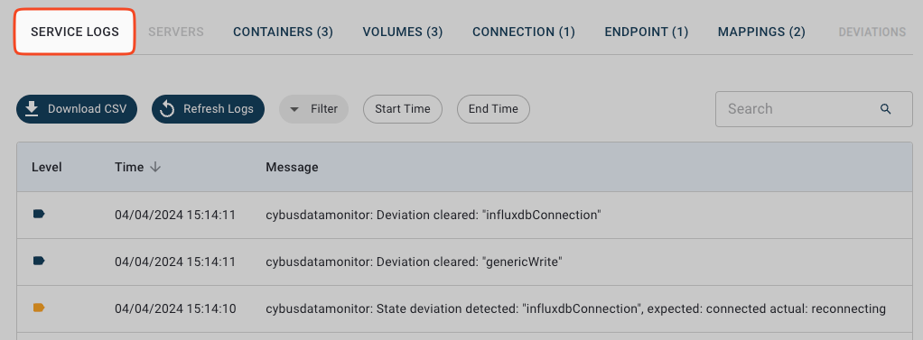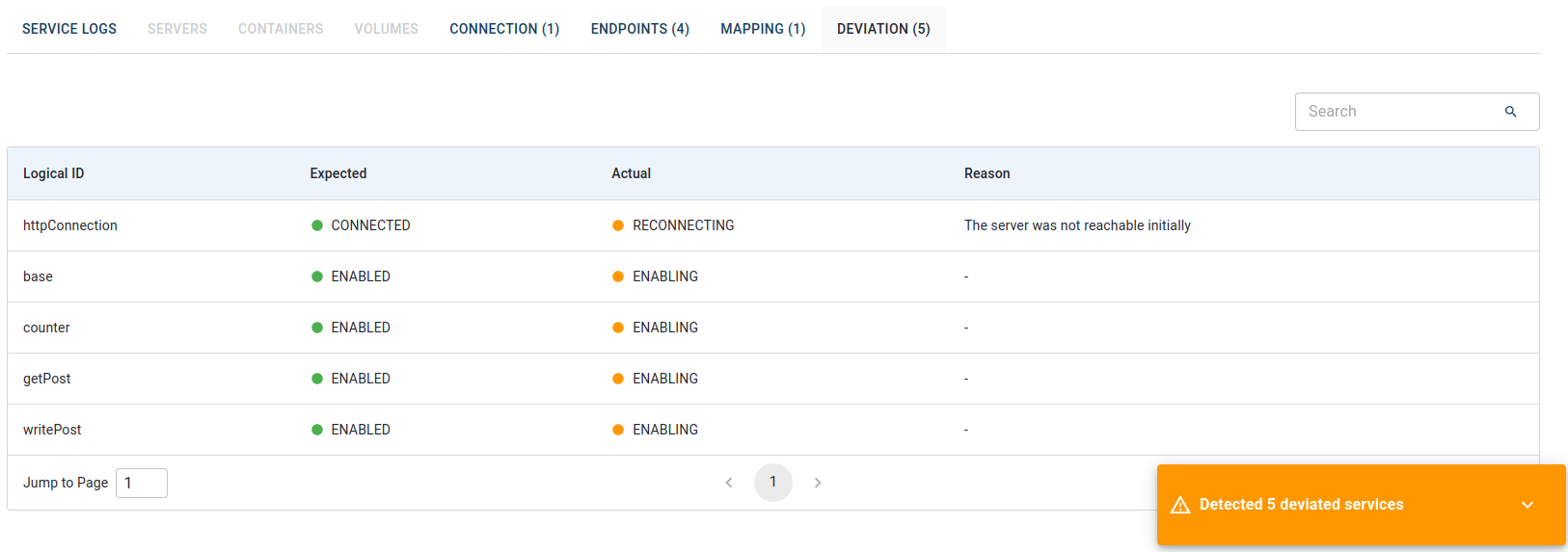 If a service does not work as expected, the service has a [deviation](https://docs.cybus.io/1-7-3/documentation/services/deviation). To see the list of all deviated services, click the `Deviations` tab.