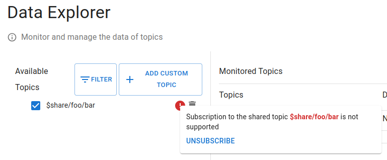 MQTT shared subscriptions are disabled on the **Data Explorer** for the smooth operation of other clients possibly subscribed to the same topics.