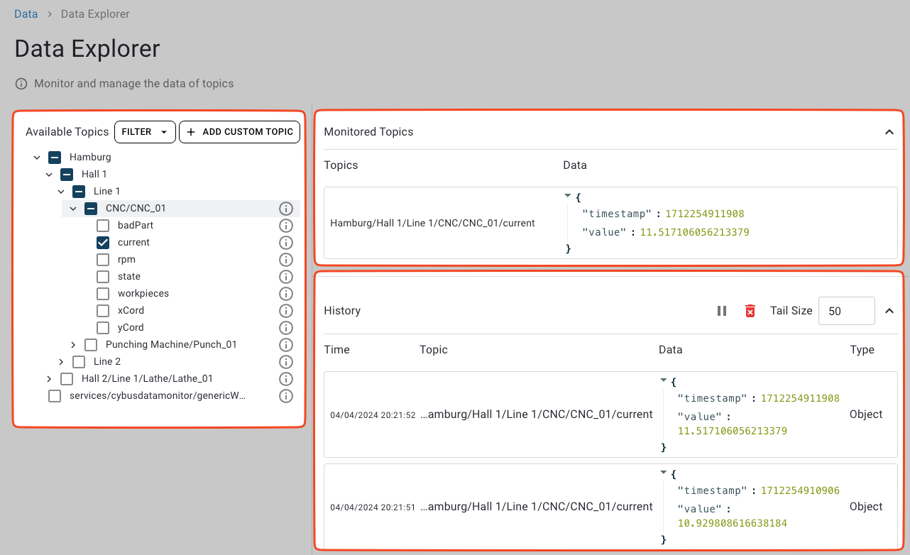 The **Data Explorer** allows you to visualize and interact with MQTT messages. These messages carry all data processed by Connectware and are organized into topics for structured data flow between publishers and consumers.