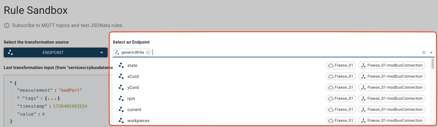 * Select the endpoints for which you want to apply data processing rules. The list displays all endpoints that are currently connected to Connectware. You can select one or multiple endpoints. If you select multiple endpoints, the **Last transformation input** field always displays the data of the endpoint that was most recently updated.