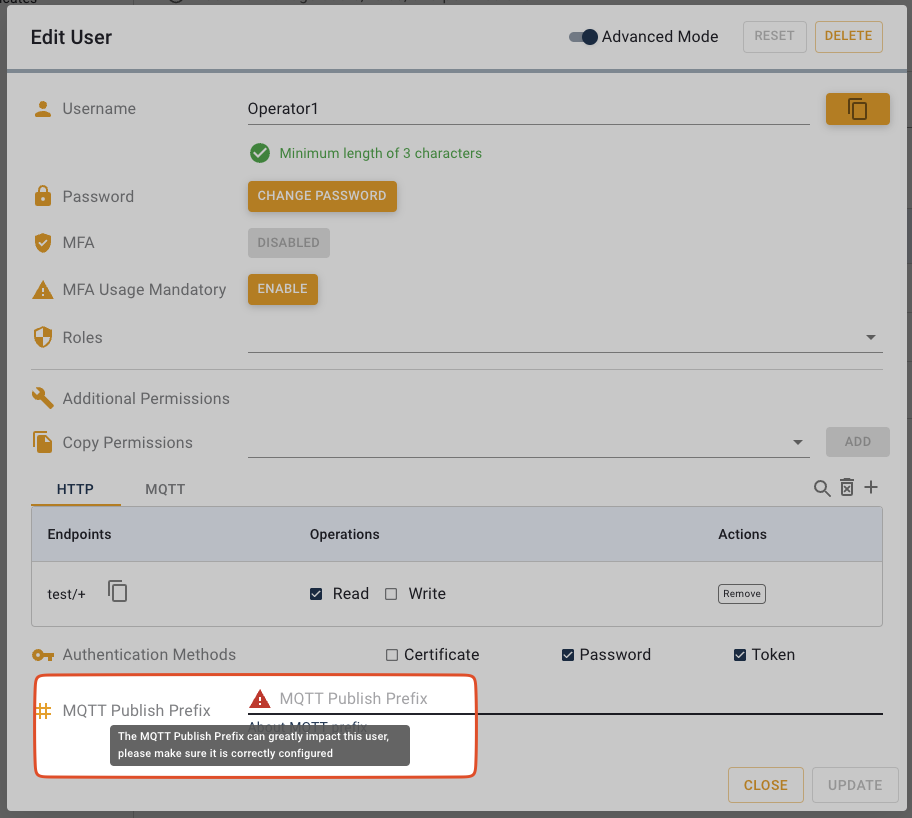 1. Add the MQTT prefix `route-to-downstream/` using the *Edit User* dialog as explained above.