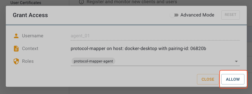 5. Click on the table entry to inspect the client request, then click `ALLOW` to grant access