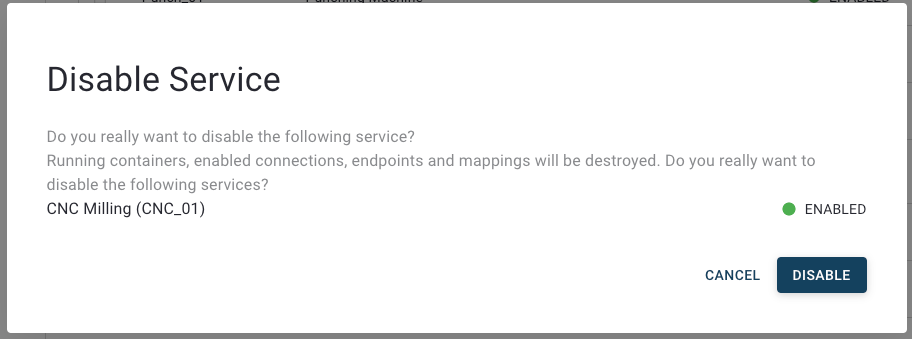 Disabling a service will terminate all running containers, active connections, endpoints, and mappings associated with it. However, volumes will remain unchanged and will automatically reattach to the service when it is re-enabled.