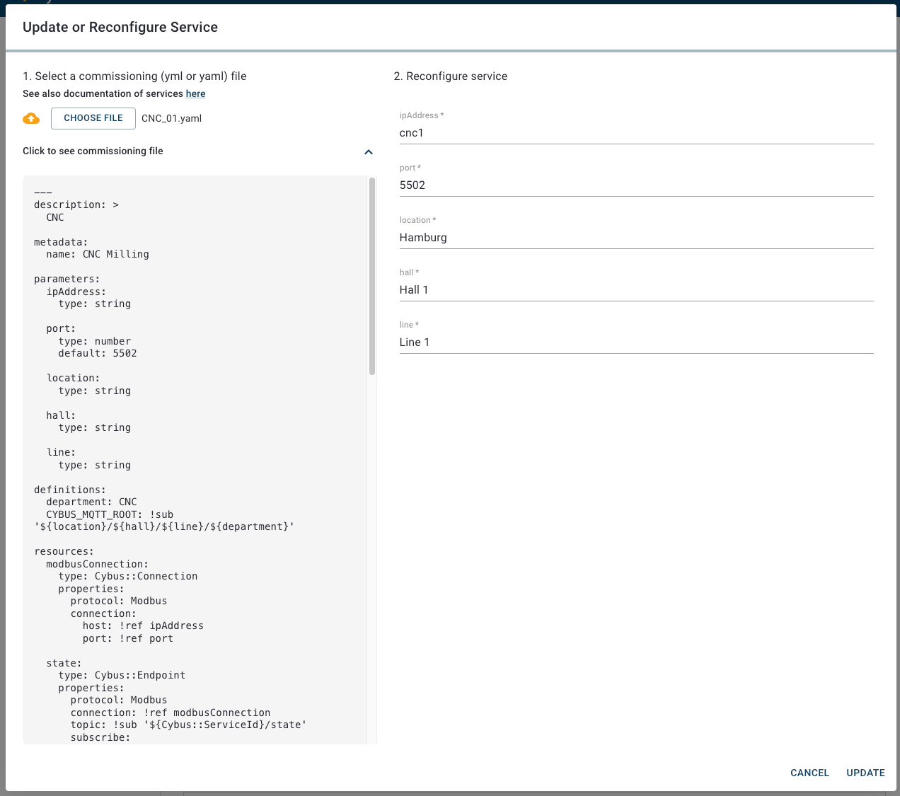 You can modify a service by either uploading an updated commissioning file or reconfiguring its parameters in the Admin UI.