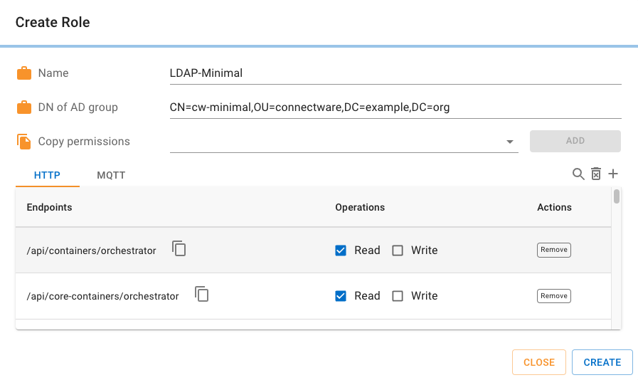**Example:** You can link the Connectware role `LDAP-Admin` to an LDAP group `cn=cw-admin,ou=connectware,dc=example,dc=org`. Users in this group automatically get the role when logging in.
