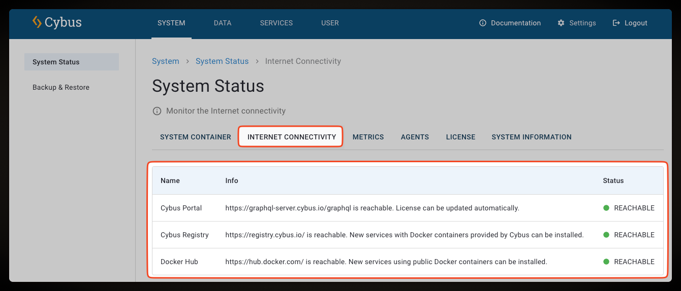 * **Cybus Registry**: Required for installing and enabling services that use Cybus-provided Docker containers. If offline, these services can only be enabled if the necessary images are already available on the local system. Installed services that have been enabled at least once are always available for use.