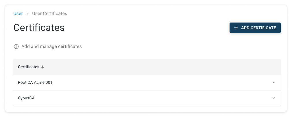 2. In the **Certificates** view, click **Add Certificate**. See [Certificates View](https://docs.cybus.io/2-0-6/documentation/security/tls-certificates/ca-certificates/certificates-view).