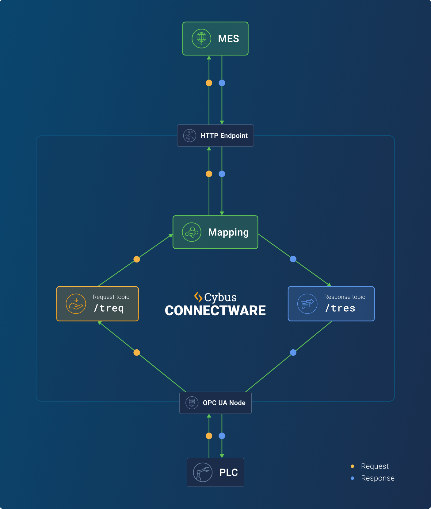 FlowSync implements synchronous request handling for HTTP server nodes and OPC UA server nodes within Connectware. When activated, Connectware suspends response generation until a corresponding MQTT message is received, enabling synchronized processing across different protocols and systems. This enables a closed communication loop between machines and IT systems, confirming every step of the data journey – even when errors occur.