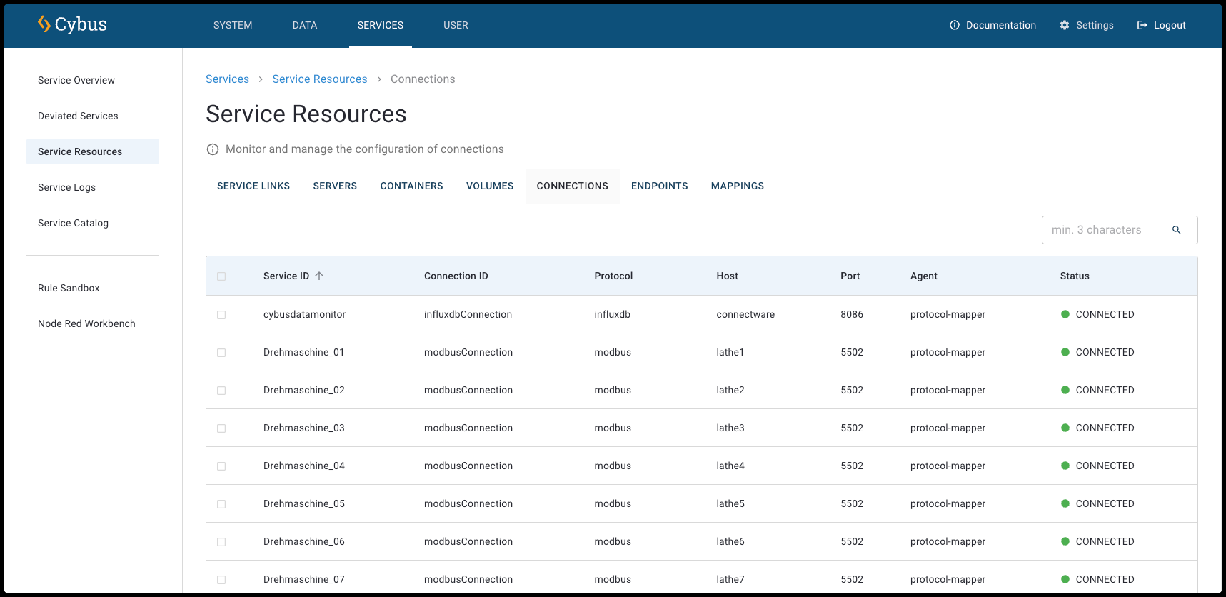 Connections are resources that allow you to connect to devices over [protocols](https://docs.cybus.io/2-0-6/documentation/industry-protocol-details). The **Connections View** shows an overview of all active and inactive protocol connections.