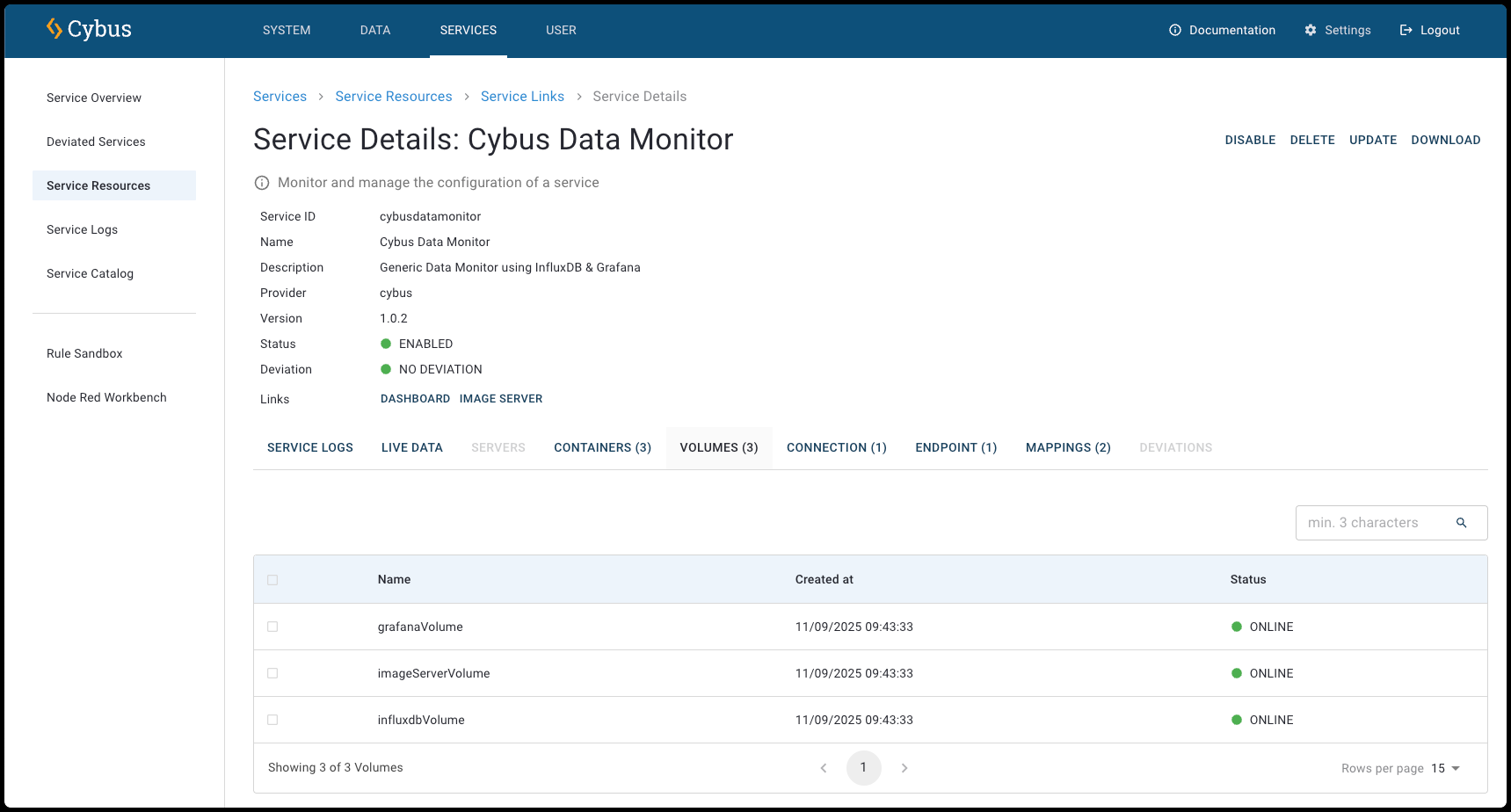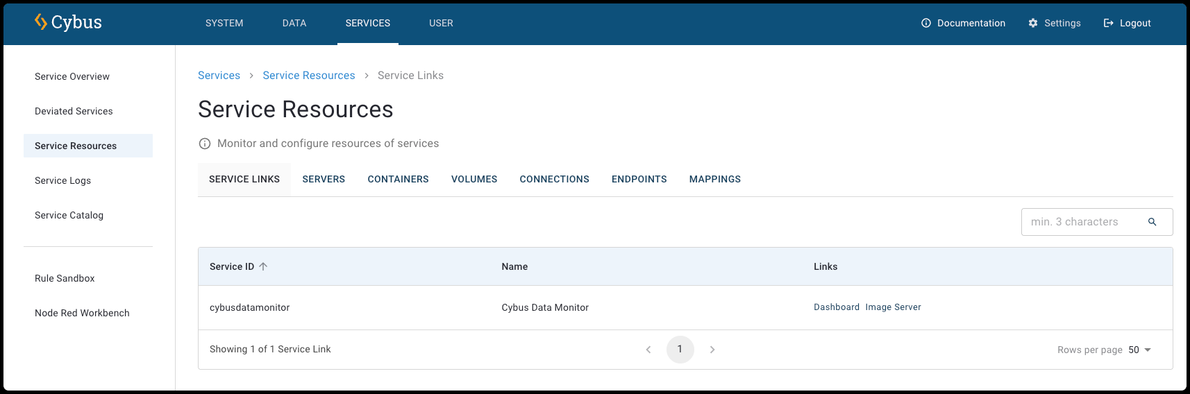 The **Service Links View** provides an overview of all [Cybus::Link](https://docs.cybus.io/2-0-6/documentation/services/service-commissioning-files/resources/cybus-link) resources. The link resource provides direct access to web resources. This resource can be external to Connectware or refer to a location that is available within a web server of a container. For more information, see [Service Links Details View](https://docs.cybus.io/2-0-6/documentation/services/service-resources-view/service-links-view).
