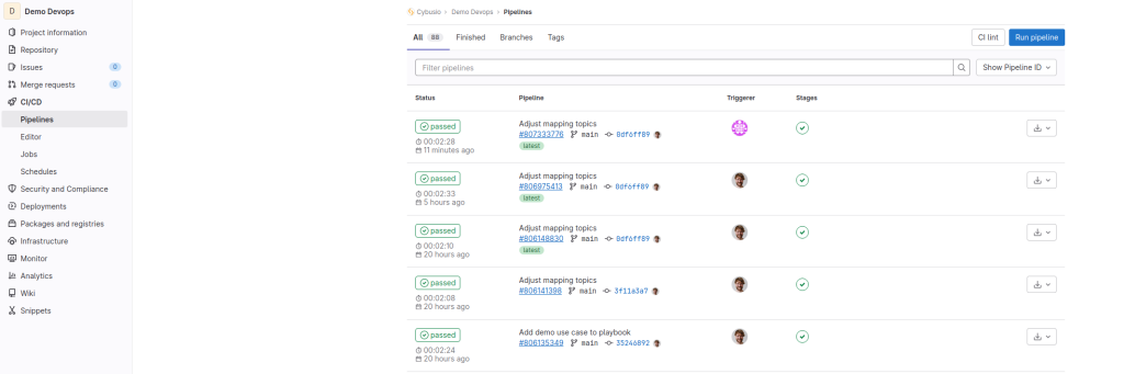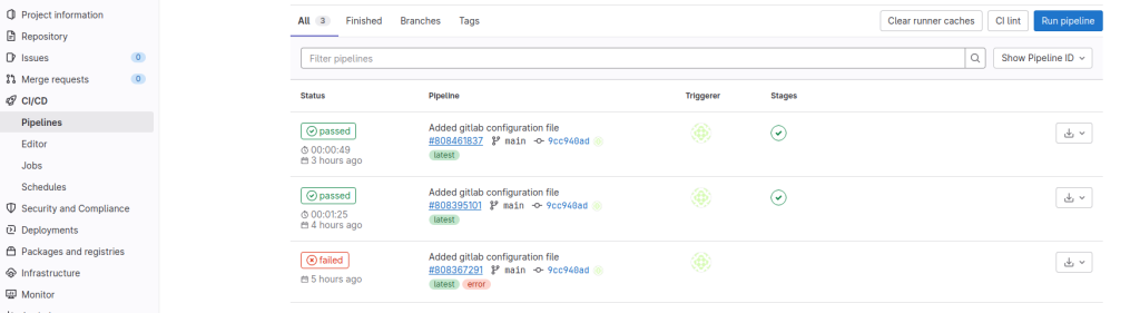 * **Pipeline trigger:** In this case, through the GitLab Web UI (Run Pipeline button). This can also be configured to be triggered by a new commit or merge event