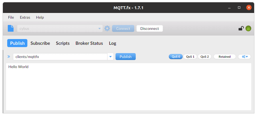 Publishing with MQTT.fx is even simpler once the connection is configured and a connection is established (indicated by the gray/green circle in the upper right corner). If the indicator shows green, we are connected and ready to publish some messages.