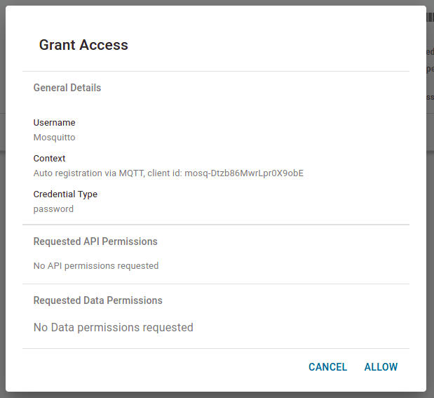 <figure><img src="https://639096190-files.gitbook.io/~/files/v0/b/gitbook-x-prod.appspot.com/o/spaces%2FfDpOJO2upcq5EpoSahvK%2Fuploads%2Fgit-blob-421b18e0cbf16f946f7a87a19c19421625aaf101%2Fgrant_access_dialog_mqtt_clients.png?alt=media" alt=""><figcaption></figcaption></figure>