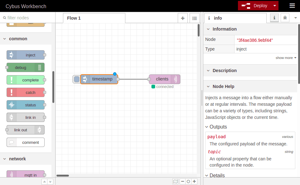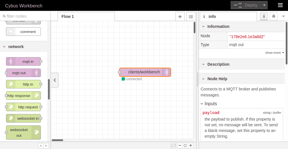 To apply the changes, click the button **Deploy** in the upper right corner. This will reset our flow and start it with the latest settings. You will now see that the MQTT node is displayed as `connected`, assuming everything was configured correctly.