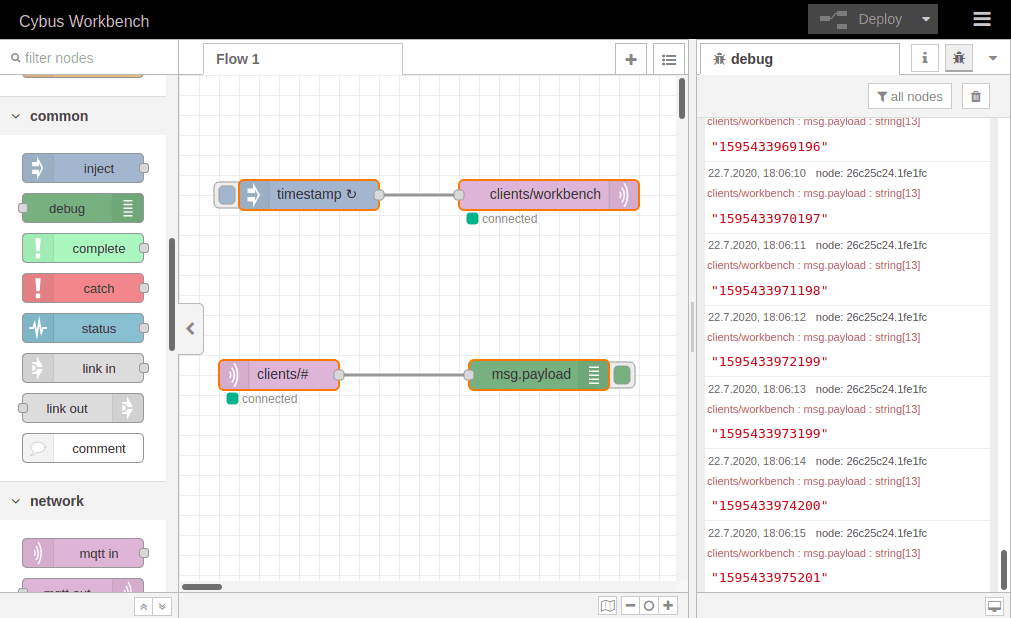 The [Node-RED Workbench](https://docs.cybus.io/2-0-6/documentation/node-red-workbench) is part of Connectware. It is a flow-based visual programming tool (based on Node-RED) for creating data flows and preprocessing data within Connectware. The Workbench provides MQTT publish and subscribe nodes, allowing you to build applications for prototyping or debugging. It also offers many other useful functions, such as creating dashboards.