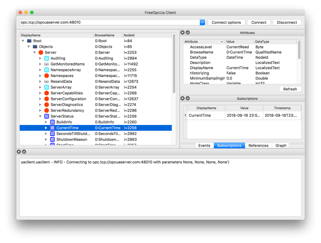 Explore and find the node which is displayed as **CurrentTime**. Select it and take a look at the **Attributes** pane – according to the **NodeClass** attribute we are dealing with a **Variable** which, by specification, contains a **Value** attribute. Variable nodes allow us to read and write data, depending on the **AccessLevel** attribute.