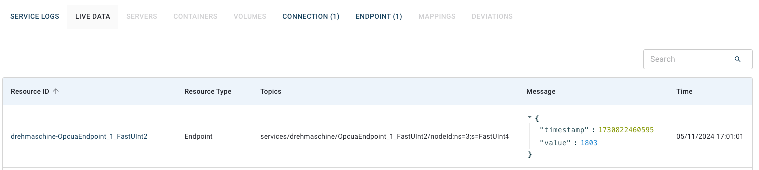 The **Live Data** tab allows you to monitor MQTT topics of the selected service directly in the **Service Details** view. Live data provide insights into topic activity, message content, and associated resources.