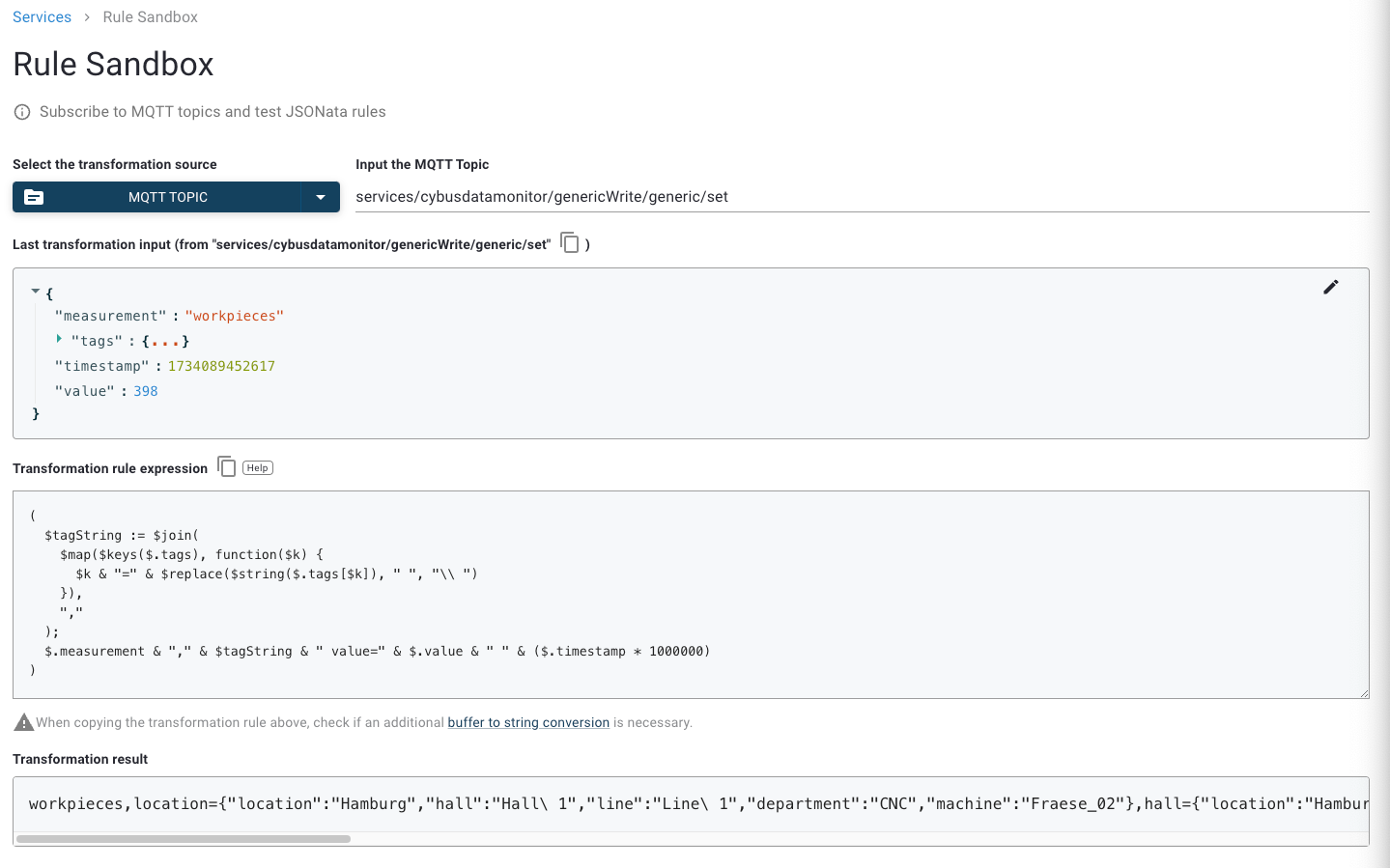3. Specify your data processing rule in the **Transformation rule expression** field. For a list of all data processing rules, see [Data Processing Rules](https://docs.cybus.io/documentation/services/rule-engine/data-processing-rules).