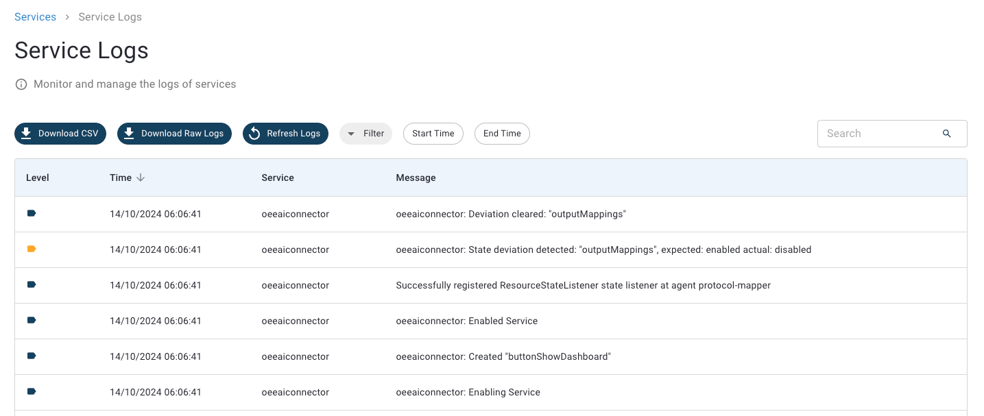 * Export the visible service log entries as a CSV file. The service log entries in the CSV file are limited to the most recent 500 lines in the current view. To download the full log, click **Download Raw Logs**.
