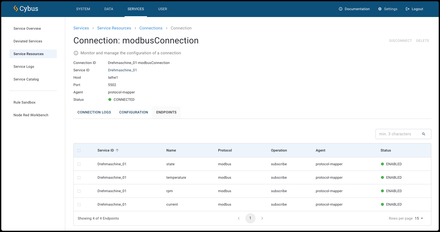 Connections are resources that allow you to connect to devices over protocols. The Connections View shows an overview of all active and inactive protocol connections.