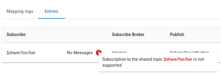 For reliable operation, MQTT shared subscriptions are not supported in the **Entries tab**, as they could interfere with other clients subscribed to the same topics.